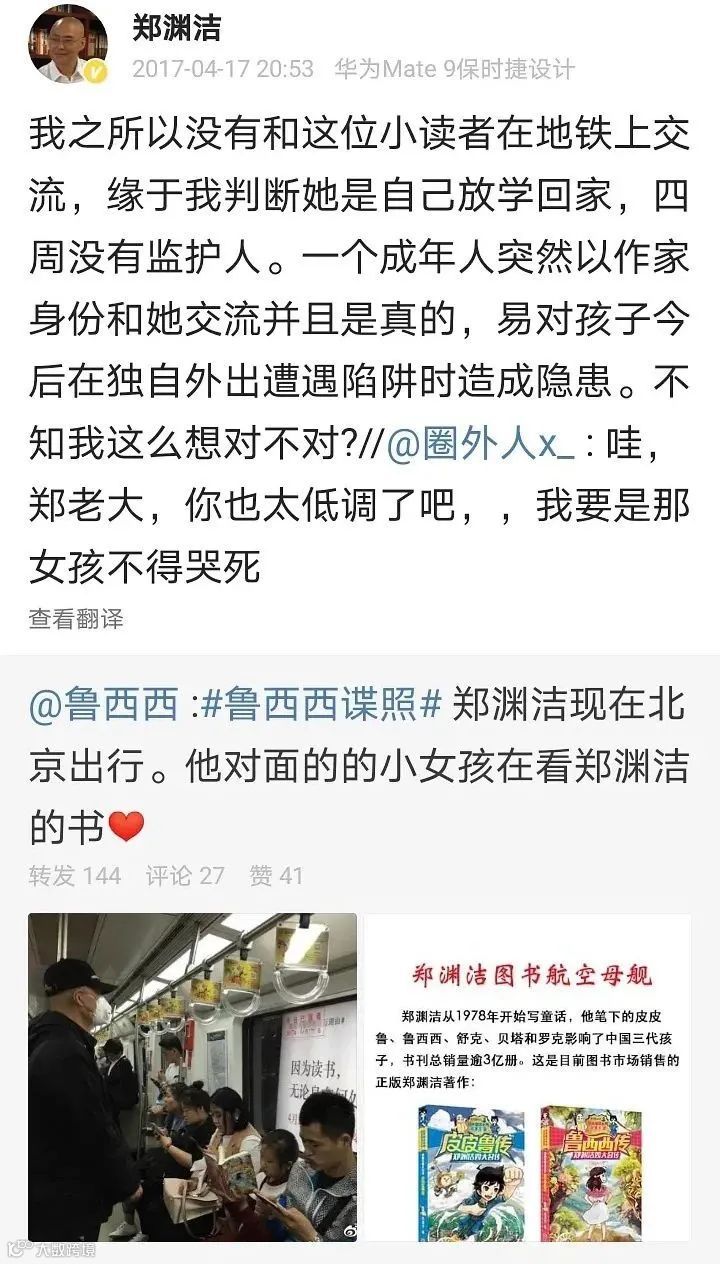 网友找出他2017年的微博,好奇他为什么不与地铁上读着自己书的小朋友打招呼,后来才发现他的“严谨”和慈爱(时年62岁)。