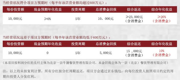 如果不考虑东家特权,根据京东众筹网站上的计算,投资者收益率有两种情况,一种是年化10%,另一种年化≥26%(见下图):
