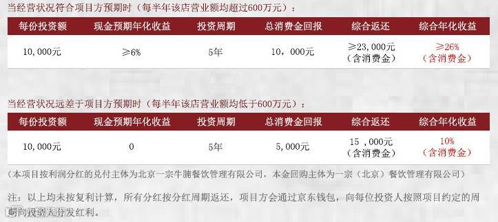 二是这个收益率的计算是将消费金等同于现金为假设条件的。如果不考虑消费金,即使是在年化26%的较理想条件下,投资人得到的现金回报也只有3000元;而在经营情况较差时,投资人无任何现金收益,只有5000元的消费金。