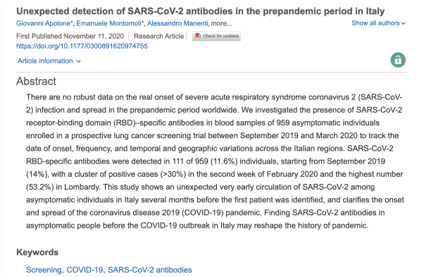 我们的研究结果表明,SARS-CoV-2在意大利的传播早于伦巴第地区官方首例确诊出现的时间,甚至远远早于中国报告首例新冠病例的时间,这为新冠大流行的溯源工作和病毒传播研究提供了新的依据。