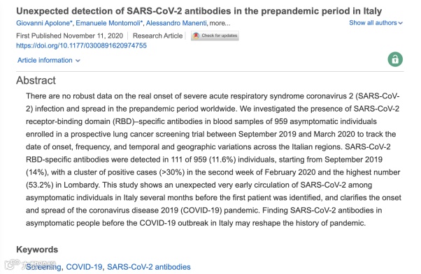 近日,意大利米兰国家肿瘤研究所(National Cancer Institute)发表的一项研究结果显示,在2019年9月采集的居民血液样本中检测出新冠病毒抗体。