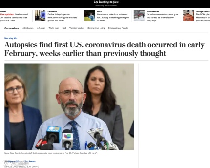 如果说以上关于病毒起源在美国的疑点都是猜测,那么美国加利福尼亚州圣克拉拉县卫生部门今年通过尸检调查发现,美国最早一例新冠死亡病例出现在2月6日,比官方公布的首例死亡病例早了20多天,则是彻底改写了美国疫情的时间线。