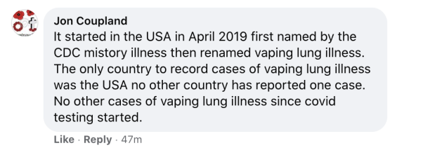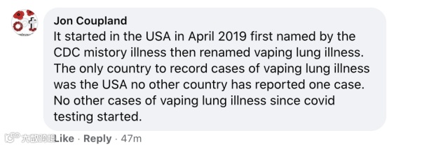 新冠从2019年4月就在美国开始了,最初被美国疾控中心命名为“神秘疾病”,后来被重命名为“电子烟肺病”。美国是全球唯一记录“电子烟肺病”病例的国家,其他国家一例都没有报告。自从进行新冠测试以来,美国再没有报告过“电子烟肺病”病例。