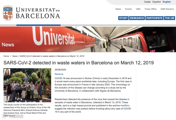 今年6月26日,西班牙巴塞罗那大学曾发布公告称,该校领导的一个研究小组在去年3月采集的巴塞罗那废水样本中检测出了新冠病毒。