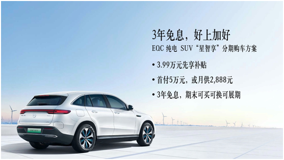而且,为了惠及更多喜欢EQC的消费者,一系列的优惠方案不断推出——“三好”电动购车计划和EQC纯电SUV“星智享”分期方案。没错,这两项与 pay by installments 分期付款相关的购车方案,让“电动+豪华”触手可及。