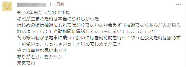 网友:在冬天寒冷的早晨坐电车去见你,等了好几个小时之后终于看到了你的样子,不由自主地叫道:“好可爱,好小啊……”现在依然是幸福的回忆!谢谢你,一定要保重。