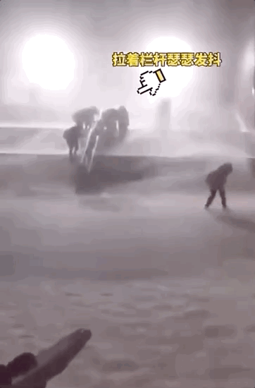 其他同学紧握栏杆防止被吹走