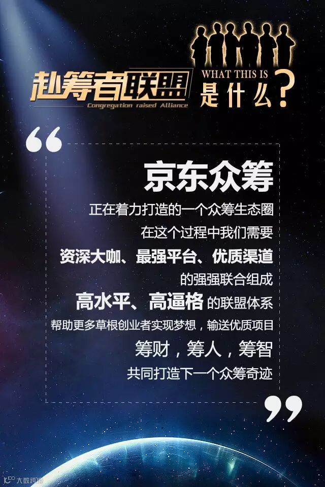 “赴筹者联盟”是京东众筹将着力打造的生态体系,将集聚圈内大咖、最强平台和优质渠道,联合各大盟友之间强势的技术、营销、品牌等资源共同搭建众筹绿色通道,为海量的创业生态指导服务,力争为“赴筹者”筹财、筹人、筹智,共同打造下一个众筹奇迹。