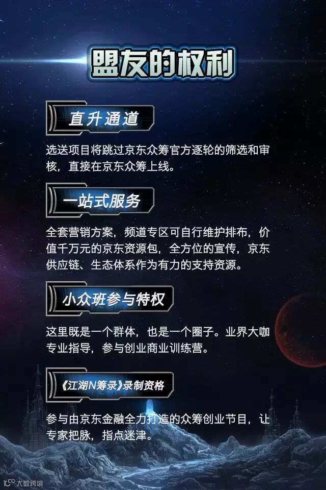 盟友条约中清楚的规定,按照盟友推荐的项目估值总额,将级别划分为钻石级盟友、黄金级盟友和白银级盟友三大类别。每个级别的盟友将享受不同的优厚待遇,总体来说包括快速众筹直升通道、营销传播一站式服务、业内大咖专业指导以及创业节目录制资格。
