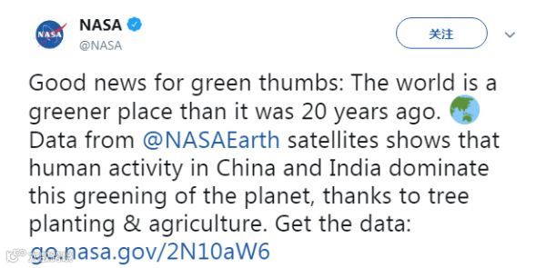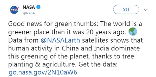 2019年,NASA曾发表报道称,与20年前相比,世界越来越绿了,而中国是促进这一改变的重要贡献者之一。
