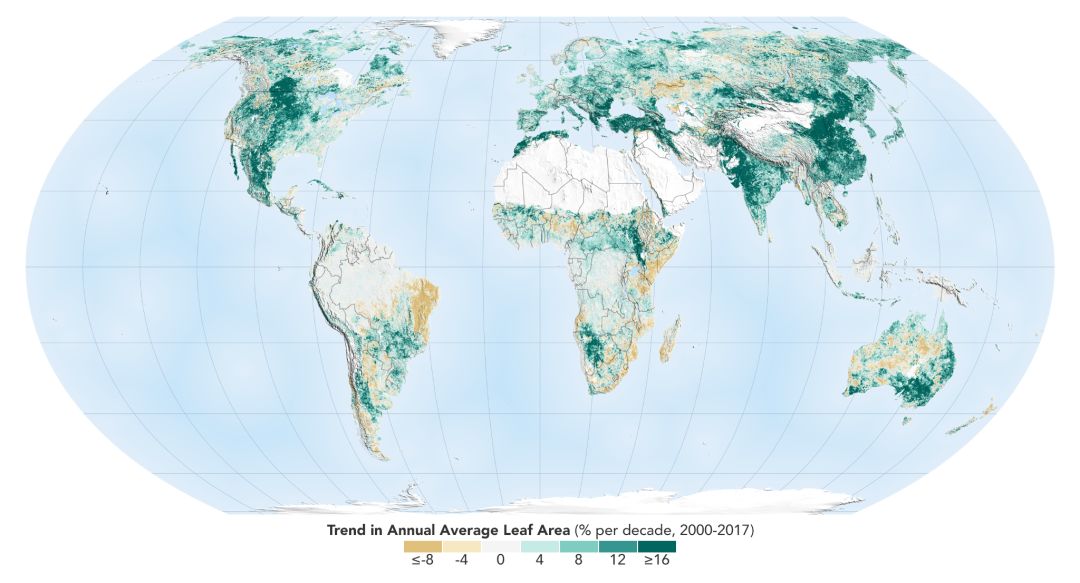 Data from NASA Earth satellites shows that human activity in China and India dominate this greening of the planet, thanks to tree planting & agriculture.
