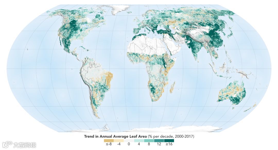 卫星数据(2000-2017年)显示,中国和印度境内的绿化带非常醒目,与世界各地的农田重叠。
