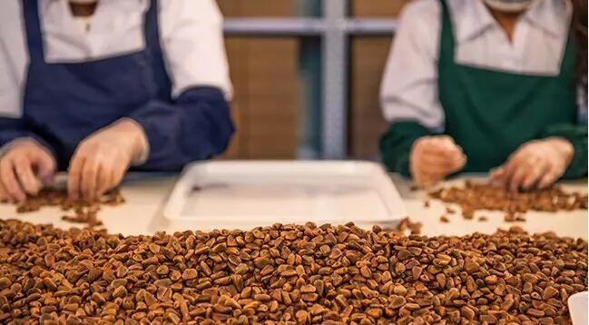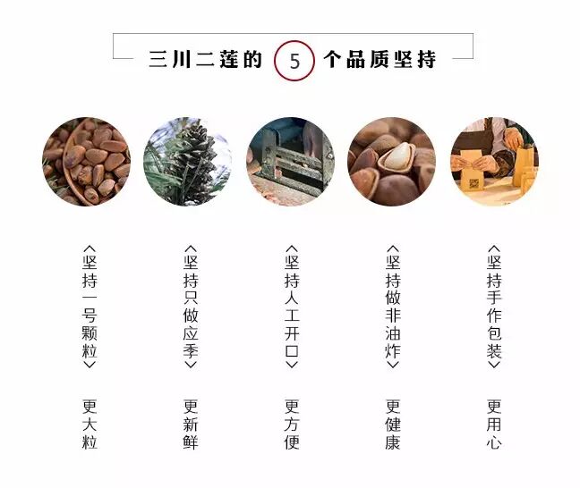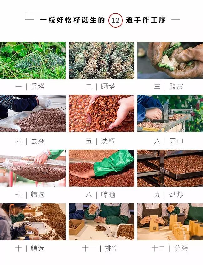这是一颗与以往你吃过都不同的松籽,从采集到分装,每一步都采取手工制作。机器制造的缺点:颗粒大小夹杂、参杂大量残渣、未开口、打开发现是空壳、油炸不健康……在手指下只剩芽芯色白的精品,轻轻一剥即可食用。