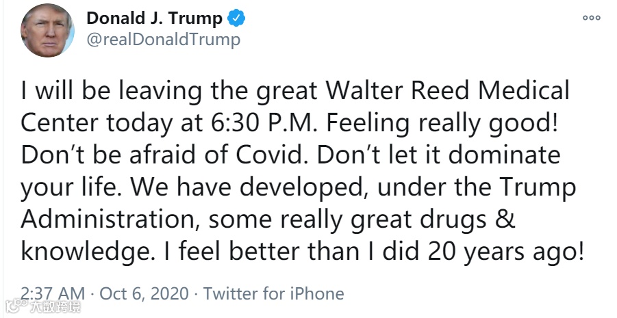 出院前几个小时,特朗普在推特上预告了这一消息,他说自己“感觉好极了”(Feeling really good! )。他呼吁人们不要害怕新冠肺炎,不要让它支配自己的生活(Don't be afraid of COVID. Don’t let it dominate your life.),他表示,在特朗普政府的领导下,美国研发了很多药物并掌握了相关知识。