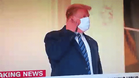 After exiting Marine One, Trump entered the White House through the Blue Room balcony. He walked upstairs from the South Portico. He then took off his mask while on the balcony and put it in his pocket while he gave two thumbs up.