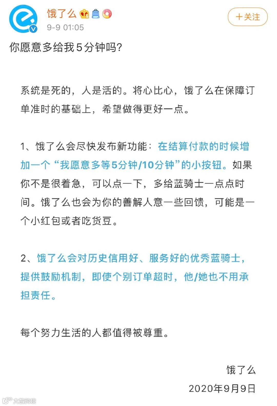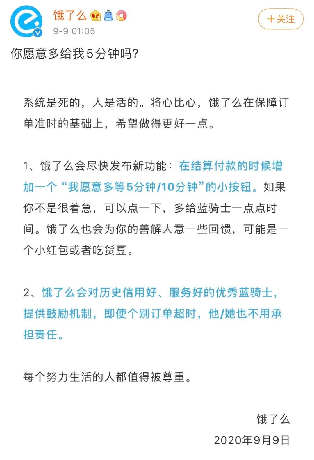 “饿了么会尽快发布新功能:在结算付款的时候增加一个 “我愿意多等5分钟/10分钟”的小按钮。如果你不是很着急,可以点一下,多给蓝骑士一点点时间。饿了么也会为你的善解人意做一些回馈,可能是一个小红包或者吃货豆。”