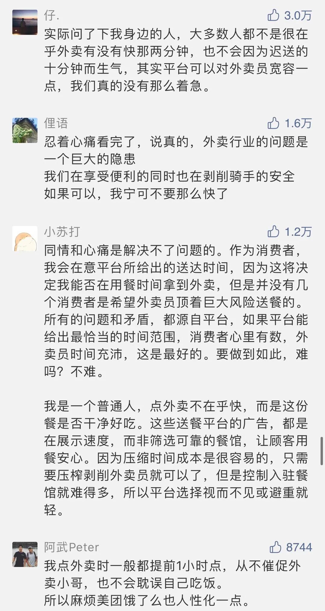 在文章评论区,网友纷纷写道“忍痛看完了”,称外卖行业的问题的确是一个巨大的隐患。一些网友甚至点名各家外卖巨头,希望平台可以“对外卖员宽容一点”“人性化一点”,从根本上解决问题。