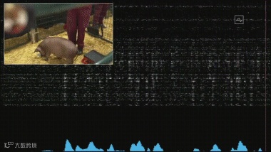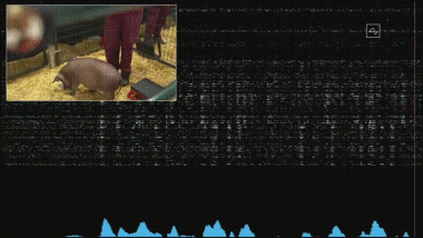 观众通过网络直播见到了Gertrude,一只两个月前被植入了芯片的猪。屏幕上的图表则显示了Gertrude大脑内部的脑电波。当她吃东西时,大脑与鼻子会交流信息,脑电波就会发出信号。