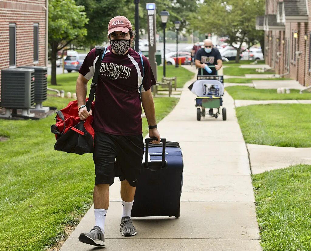当地时间2020年8月19日,美国宾夕法尼亚州库茨敦,学生佩戴口罩,进行体温检测后进入库茨敦大学。