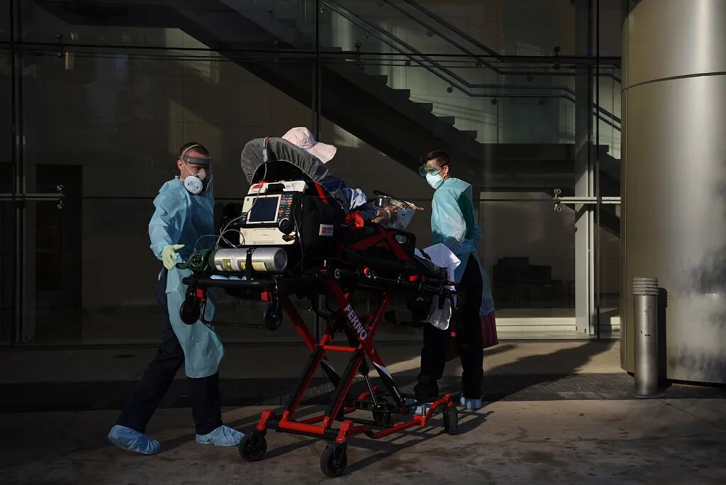 当地时间2020年8月19日,美国休斯敦,Orion EMS员工护送一名新冠病毒检测呈阳性的患者。