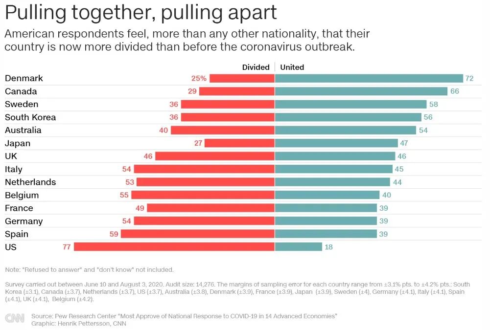 8月27日公布的一项调查显示,在公民被问及本国现在是否比疫情暴发前更团结的十几个国家的中,美国远远排在最后一位。