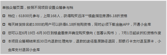 如果把众筹比作一个外表华丽的蛋糕,味道好不好是其次,食用安不安全,才是最重要的,而这个责任则全依赖“蛋糕师”值不值得信任,风控意识一定要有。其次,才是收益问题,在安全有保障的情况下,当然哪个好吃选哪个。花最少的钱买到性价比最高的房子是每个购房人的目标。