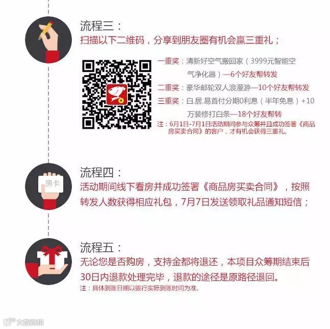 以我个人为例,去年双11,我参加了京东和远洋所发起的房产众筹项目。之所以会选择京东,完全依赖于该活动在朋友圈的刷屏之势和双方品牌的信任。抱着试一试的心态,我打开页面完成注册,按照流程支付11元,就有可能享受1折买房的优惠。虽然结果证明我没有那么幸运,但是也是得大于失,11元本金返还的同时,还得到了京东代金券。