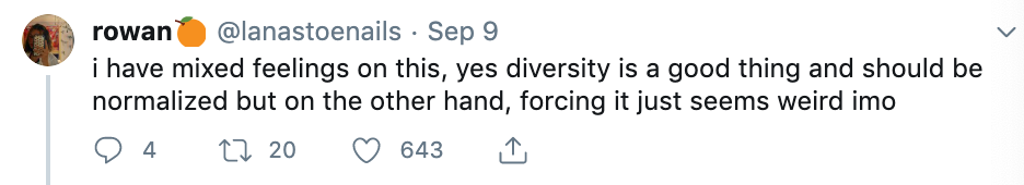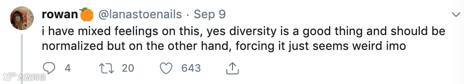 我对此有着非常复杂的情绪,多样性确实是好的,但也应该正常化,强迫应用在我看来难免有些怪了。