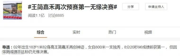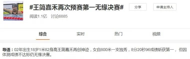在周六的比赛中,余贺新刷新男子50米自由泳全国纪录,但是他之前的体测成绩名列第九,无缘决赛。18岁的王简嘉禾创造了女子1500米自由泳的亚洲记录,她的体测成绩却只位列第十一,同样出局。