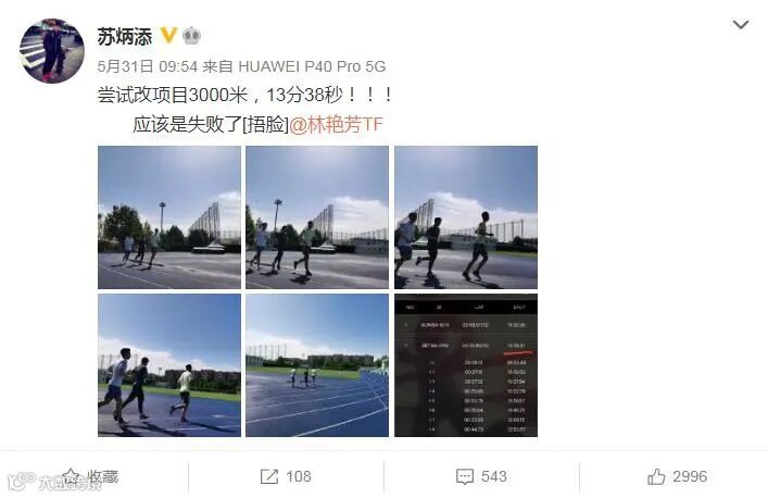 此前,短跑名将苏炳添也晒出自己3000米长跑的成绩,并自嘲说改项目“失败”。