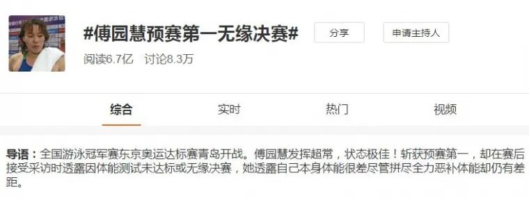 最近,2020全国游泳冠军赛东京奥运达标赛在青岛开战,游泳名将傅园慧表现出不错的状态,在项目预赛中拿到第一名。