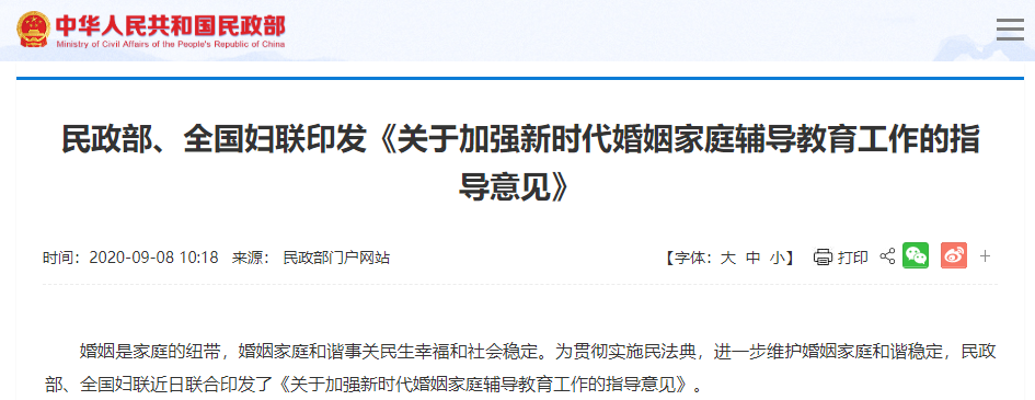 民政部、全国妇联近日联合印发了《关于加强新时代婚姻家庭辅导教育工作的指导意见》,提出在婚前、颁证、离婚等环节加强和改进婚姻家庭辅导教育工作,引导群众建立和维护平等、和睦、文明的婚姻家庭关系。
