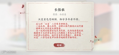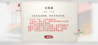 游戏中即点即看的原文注释也让诗歌品鉴的体验更加流畅无阻。“汉皇重色思倾国,御宇多年求不得”作为《长恨歌》的开篇之句,也许会让不熟悉的用户一上来就有点不明所以:明明是唐玄宗,为何又讲汉皇?作为一首长篇叙事诗,《长恨歌》中类似的指代、典故等不时出现,在某网络词条中仅注释就多达74处。用户在阅读时如果频频遇到理解上的困难,就好比一边翻词典一遍硬啃外语文献,影响体验。