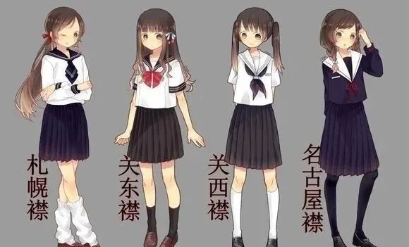 水手制服又根据不同的领子样式,分为札幌襟、关东襟、关西襟和名古屋襟。