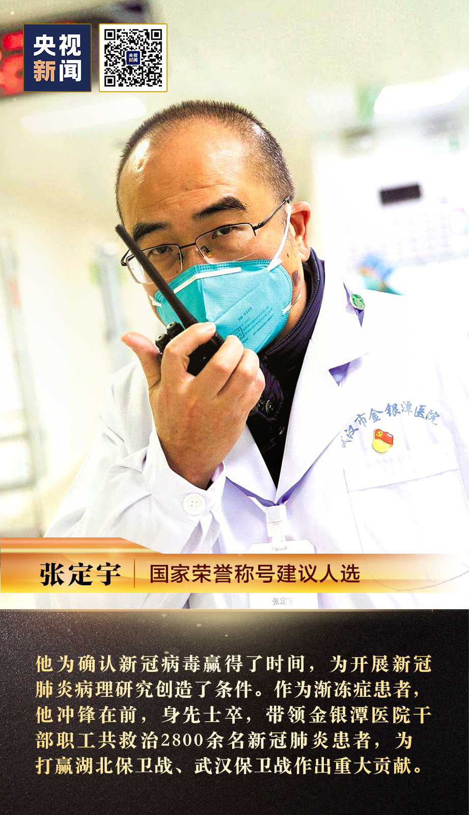 张定宇,男,汉族,中共党员,1963年12月生,河南确山人,湖北省卫生健康委员会副主任、武汉市金银潭医院院长。他长期在医疗一线工作,曾带队赴汶川抗震救灾,多次参加国际医疗援助。2019年12月29日,在收治首批7名不明原因肺炎患者后,他立即组建隔离病区,率先采集样本开展病毒检测,组织动员遗体捐献,为确认新冠病毒赢得了时间,为开展新冠肺炎病理研究创造了条件。作为渐冻症患者,他冲锋在前,身先士卒,带领金银潭医院干部职工共救治2800余名新冠肺炎患者,为打赢湖北保卫战、武汉保卫战作出重大贡献。荣获“全国卫生健康系统新冠肺炎疫情防控工作先进个人”称号。
