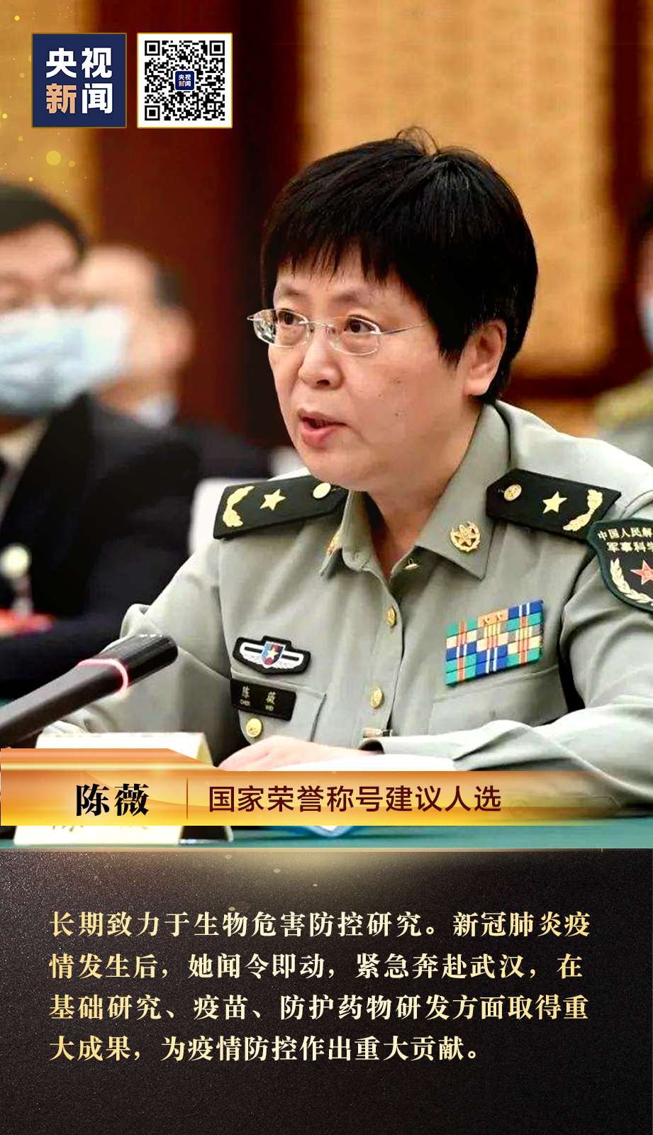 陈薇,女,汉族,中共党员,1966年2月生,浙江兰溪人,军事科学院军事医学研究院生物工程研究所所长、研究员。第十二届全国人大代表,第十三届全国政协委员。她长期致力于生物危害防控研究,研制出我军首个SARS预防生物新药“重组人干扰素ω”、全球首个获批新药证书的埃博拉疫苗。新冠肺炎疫情发生后,她闻令即动,紧急奔赴武汉执行科研攻关和防控指导任务,在基础研究、疫苗、防护药物研发方面取得重大成果,为疫情防控作出重大贡献。荣获“全军防治非典先进个人”“全国十大杰出青年”等称号。