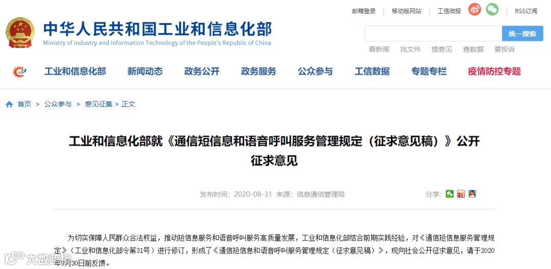 8月31日,工信部表示正在就通信短信息和语音呼叫服务管理规定征求公众意见。