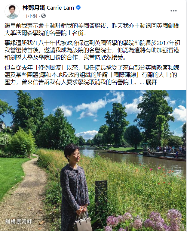 林郑月娥表示,“继早前我表示会主动注销我的美国签证后,昨天我亦主动退回英国剑桥大学沃尔森学院的名誉院士名衔。”