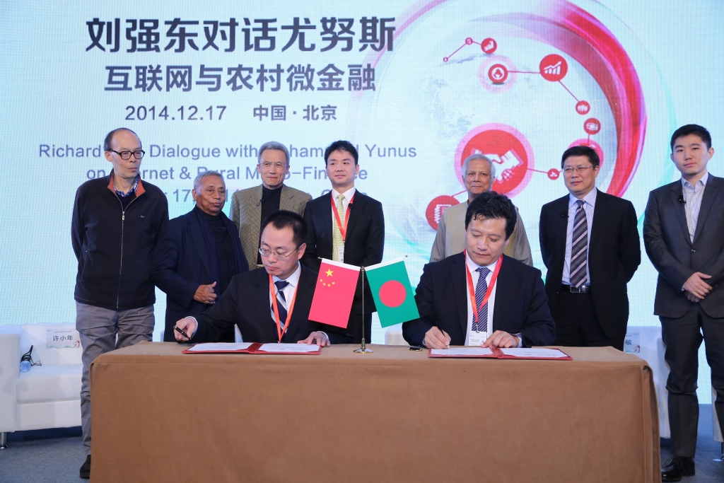 尤努斯教授现场邀请刘强东先生加入格莱珉中国董事会,成为第一名企业董事成员,刘强东先生欣然同意并接受了聘书,并表示会与格莱珉一道,为中国农村消除贫困做出贡献。
