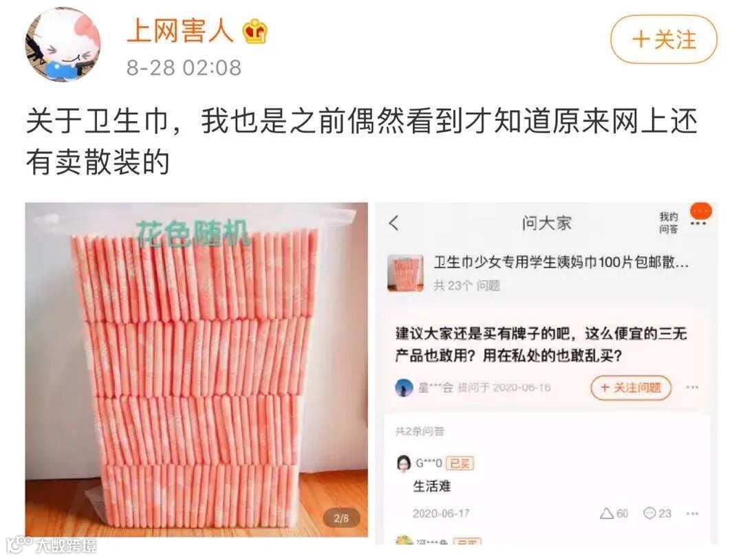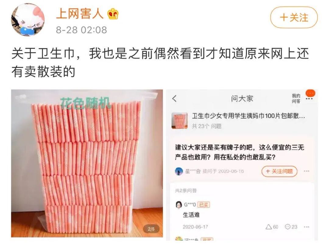 8月28日,一位网友发布了两张图片:“关于卫生巾,我也是之前偶然看到才知道原来网上还有卖散装的。”这条帖子迅速引起关注。