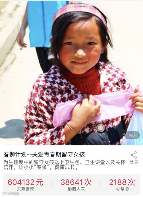 In June, students from the Stand TogetHer organization of a high school in southwest China's Chengdu have launched a program to donate menstrual pads to teenage girls in Zhaojue county, one of the poorest areas in China. They raised around 17,500 US dollars online in just two days, providing a whole year's worth of pads for 700 girls.