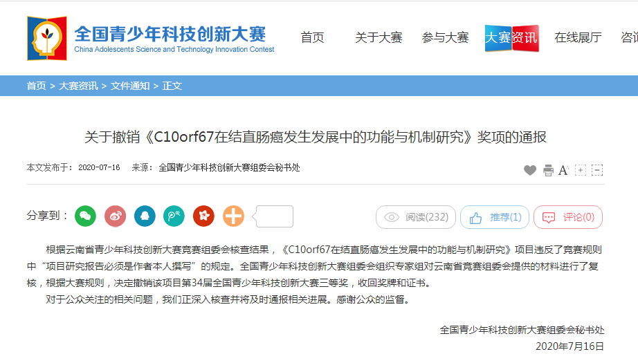 On the same day, an official announcement from the office of CASTIC's organizing committee declared the prize canceled, recalling the medal and certificate awarded to the sixth-grader.
