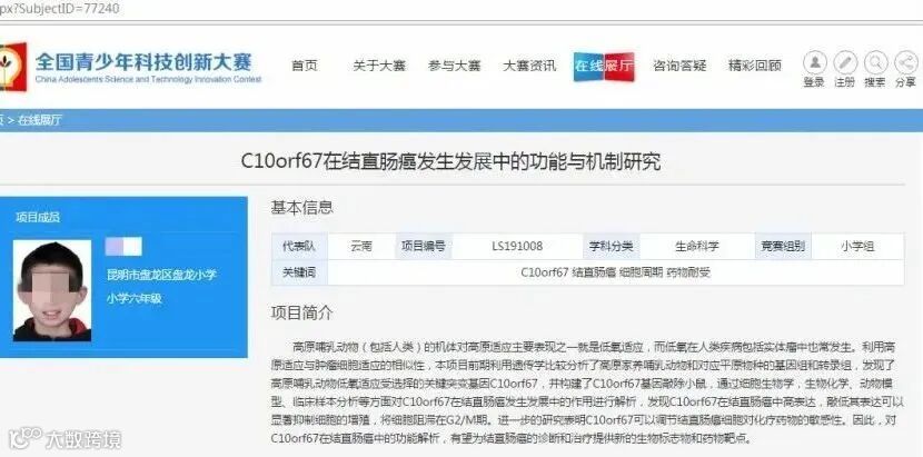 近日,云南省昆明市一名六年级小学生以“C10orf67在结直肠癌发生发展中的功能与机制研究”项目,获得第34届云南省青少年科技创新大赛一等奖、第34届全国青少年科技创新大赛三等奖,引发社会关注。