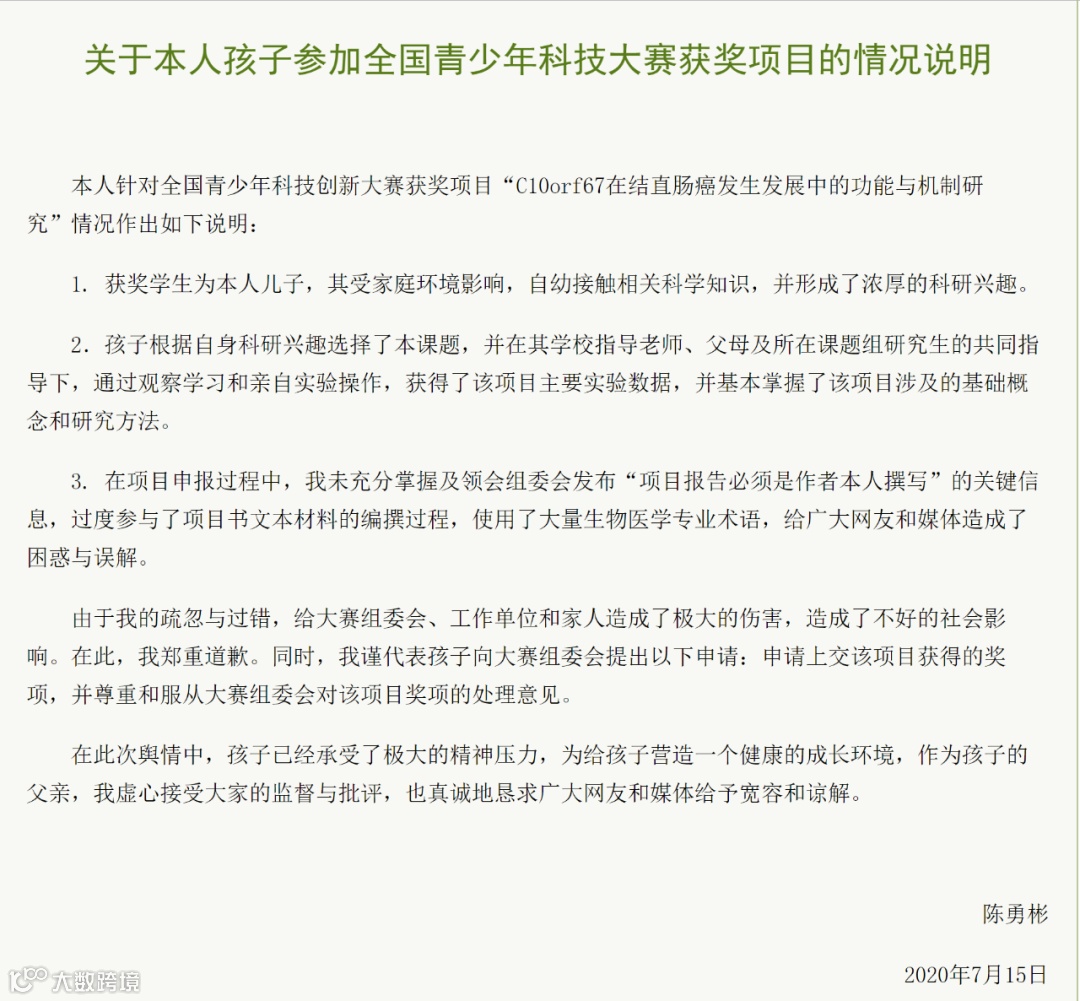The father of a primary school student who won third prize at a national science contest last year for work on colorectal cancer has acknowledged and apologized for his “over-involvement” in his child’s project, he said in a statement on ScienceNet.cn on Wednesday.