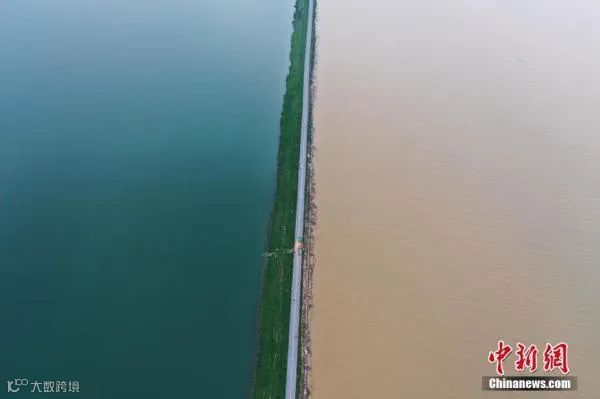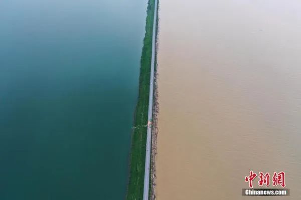 7月12日下午,航拍位于鄱阳湖东岸的江西鄱阳县珠湖联圩,一侧为清澈的鄱阳湖内湖珠湖,一侧为因暴雨变浑浊的鄱阳湖外湖,呈现一堤之隔泾渭分明的景观