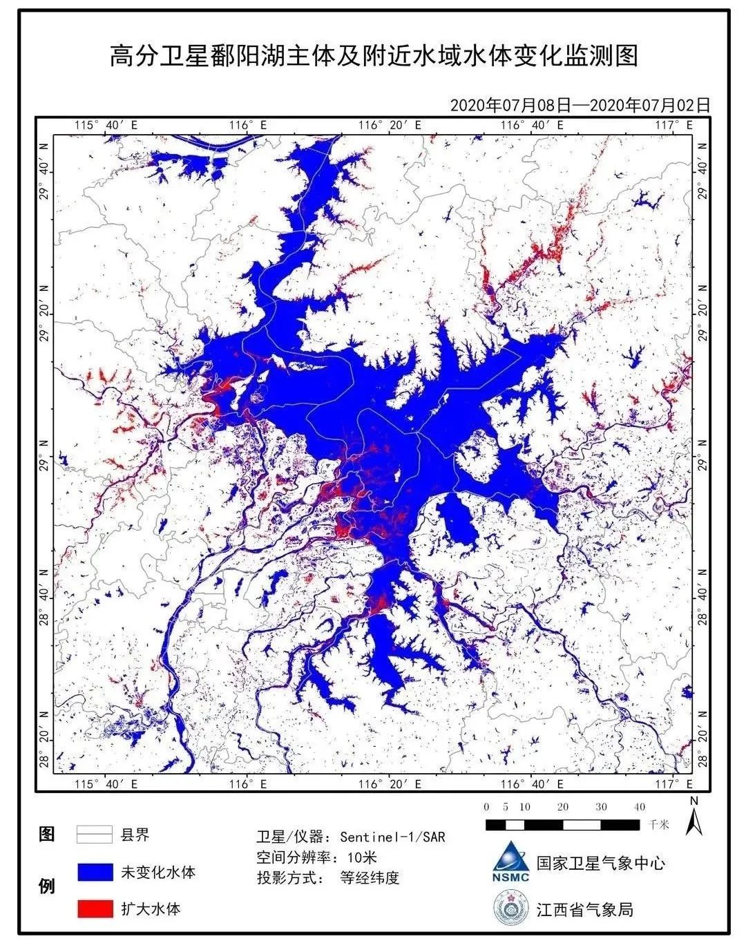 据12日公布的数据,卫星遥感监测显示7月8日18时,鄱阳湖主体及附近水域面积较7月2日扩大352平方公里,达4206平方公里,为近10年来最大,较历史同期平均值(3510平方公里)偏大两成,五大支流入湖口湿地大面积被淹。未来几天鄱阳湖水位将继续上涨,水域淹没范围逐步扩展。