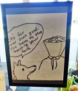 这家宠物店的标牌,画中人带上了用来防止宠物舔伤口的伊丽莎白圈: