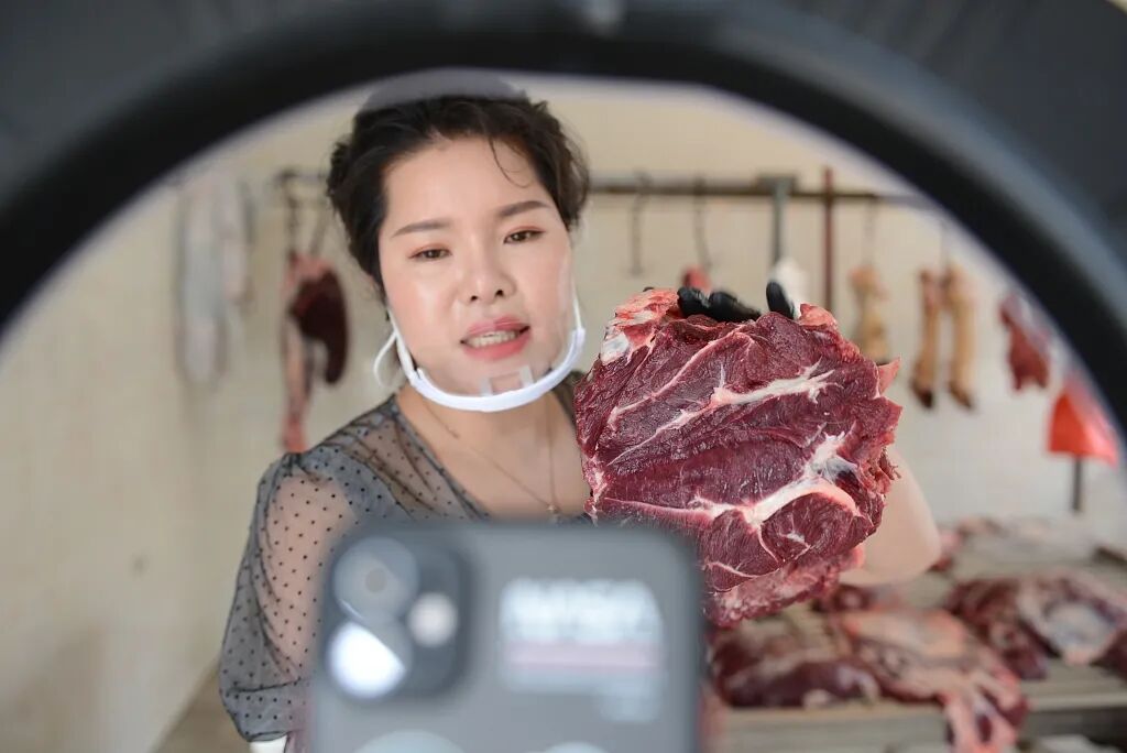 2020年8月3日,江苏淮安街西居委会正在通过手机直播平台“直播带货”卖牛肉