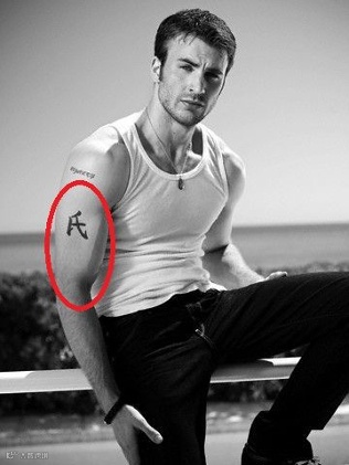 美国队长Chris Evans在右臂肱二头肌上文了个汉字“氏”,他还以为这个字的意思是“家庭”。遗憾的是,氏一般加在丈夫的姓后面用来称呼已婚女士。