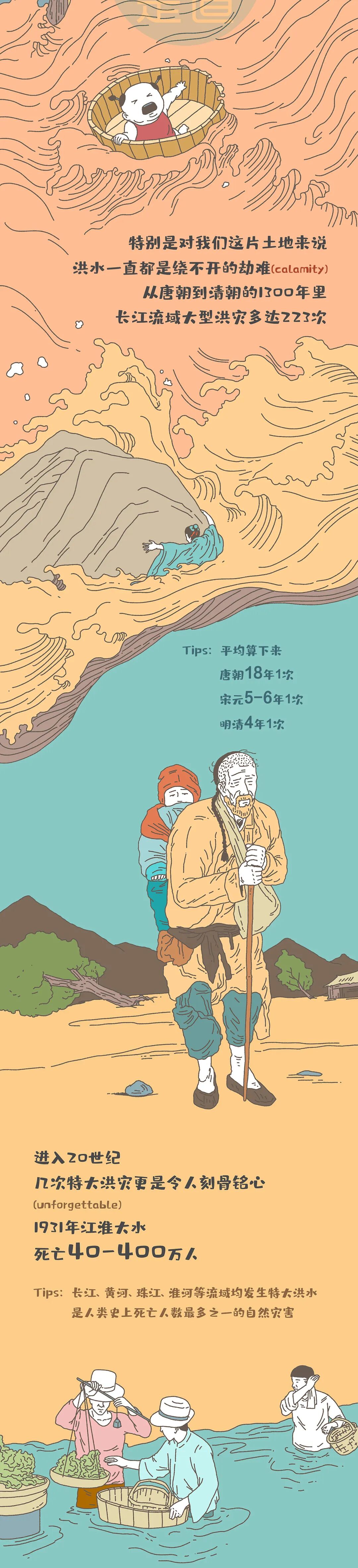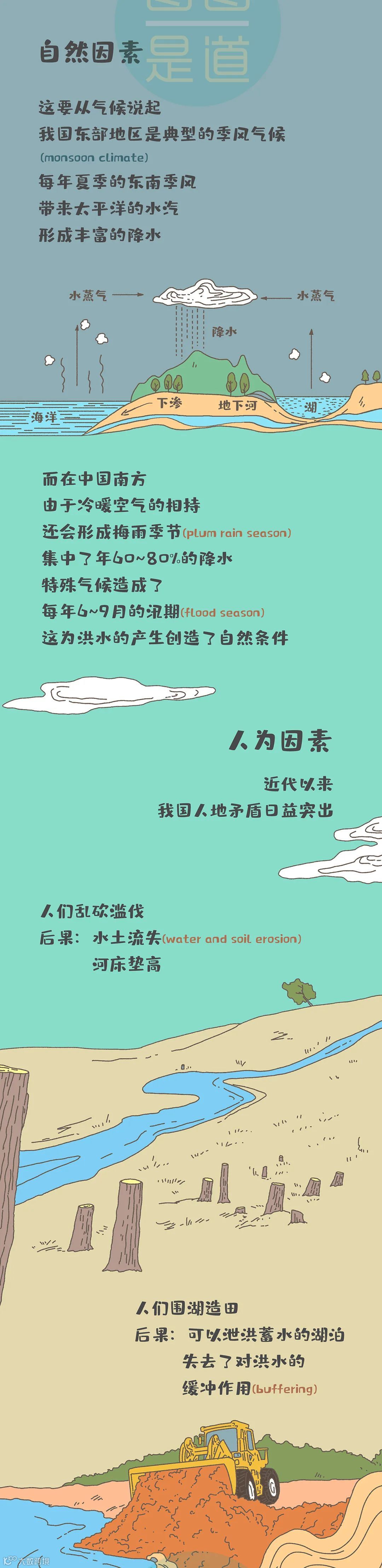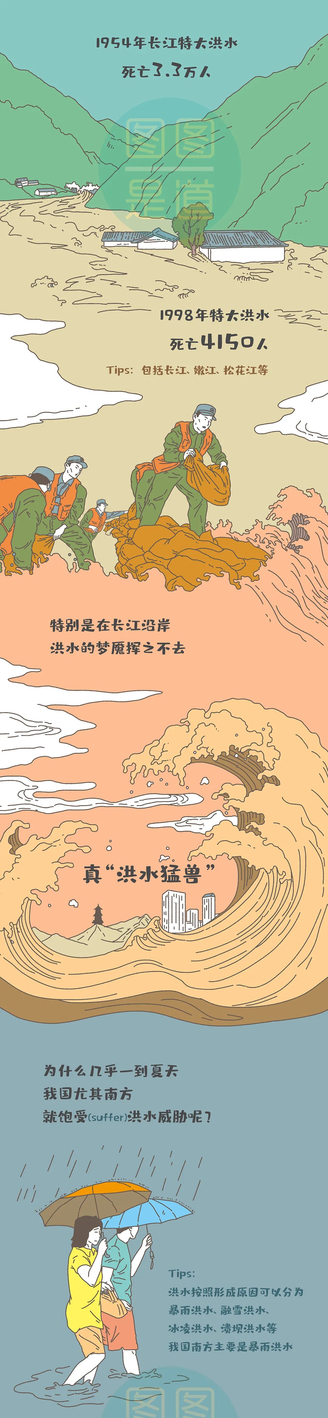 天地玄黄,宇宙洪荒相传在远古时期万物一片混沌(chaos)这时天地间发生了一次巨大的洪水(flood)几乎将世界毁灭这种野蛮而恐怖的力量就是洪荒之力特别是对我们这片土地来说洪水一直都是绕不开的劫难(calamity)从唐朝到清朝的1300年里长江流域大型洪灾多达223次进入20世纪几次特大洪灾更是令人刻骨铭心1931年江淮大水,死亡40-400万人1954年长江特大洪水,死亡3.3万人1998年特大洪水,死亡4150人洪水的梦魇笼罩在长江沿岸挥之不去为什么几乎一到夏天我国尤其南方就饱受(suffer)洪水威胁呢?1、自然因素这要从气候说起我国东部地区是典型的季风气候(monsoon climate)每年夏季的东南季风带来太平洋的水汽形成丰富的降水 而在中国南方由于冷暖空气的相持还会形成梅雨季节集中了年60~80%的降水特殊气候造成了每年6~9月的汛期(flood season)这为洪水的产生创造了自然条件